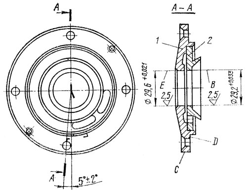 Проверьте, есть ли люфт подшипника относительно фиксатора, покачивая подшипник рукой. После установки фиксатора подшипник должен сохранить подвижность относительно корпуса. Поверните приспособление с корпусом компрессорной стороной вверх. Установите в выточку корпуса прокладку 2, совместите отверстия на прокладке и корпусе. Установите диск 8 с щитком 7, собранный как показано на рис. 29. Вверните винты 17 (см. рис. 28) и раскерните в двух диаметрально противоположных точках А.