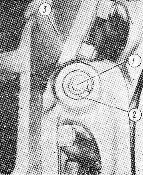 Замыкающий палец 2 ( рис. 272 ) на гусенице имеет конусные стопоры с обеих сторон. Установите трактор так, чтобы замыкающий палец оказался впереди и немного ниже оси натяжного колеса. Ослабьте натяжение гусеницы, вывернув пробку 2 ( см. рис. 295 ) механизма натяжения на 3...4 оборота. Снимите со звеньев, соединенных замыкающим пальцем, два башмака ( см. рис. 272 ). Выньте пробки 1 из отверстий конусных стопоров замыкающего пальца.