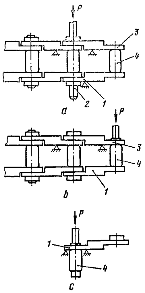 Установите гусеничную ленту на приспособление пресса (рис. 276, а). Выпрессуйте палец 2, соседний с замыкающей втулкой 4. Выпрессуйте замыкающую втулку 4 (рис. 276, b) вместе со звеном 1 и снимите звено 3. Установите звено 1 ( рис. 276, c) с замыкающей втулкой 4 под пресс и выпрессуйте замыкающую втулку 4. Аналогично разъедините остальные пары звеньев. Допустимая высота звена с износом беговой дорожки 117,5 мм. Предельная высота 110,0 мм. Допускаемые сколы на концах башмака площадью не более 2000 мм².