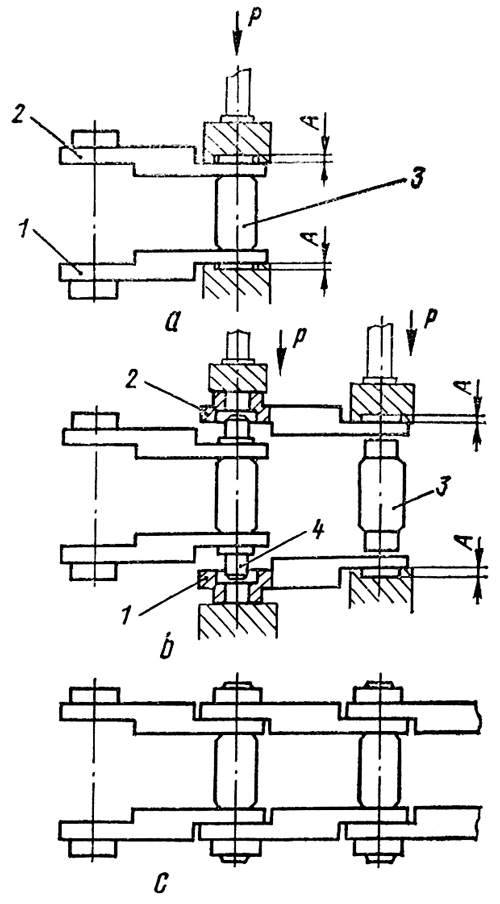 Установите левое 1 ( рис. 277, а ) и правее 2 звенья на приспособление пресса и Между ними поставьте втулку 3. Напрессуйте звенья на втулку. Торцы втулок должны выступать на размер А= (13,5±0,1) мм. Вставьте палец 4 ( рис. 277, b ) во втулку. Приставьте к торцам пальца звенья левое 1 и правое 2 и между ними поставьте следующую втулку 3. Напрессуйте двухштоковым прессом оба звена на палец и втулку ( рис. 277, с ). Аналогично собирайте последующие пары звеньев. При сборке тридцать восьмой последней пары установите замыкающую втулку, которая короче остальных на 27 мм..Торцы замыкающей, втулки не должны выступать над плоскостью звена. Установите на звенья 38 башмаков и закрепите каждый башмак четырьмя болтами с гайками. Момент затяжки болтов 500...550 Н-м (50...55 кгс-м). При несовпадении отверстий в звеньях и башмаках под болты разверните отверстия на диаметр 20,4±0,28 мм.
