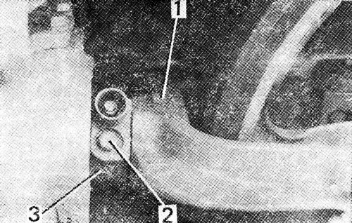 Отверните пробку 2 на 3...4 оборота и выпустите смазку из полости механизма натяжения. Рассоедините гусеницу и подайте трактор назад так, чтобы освободить натяжное колесо. Отверните болт 1 и выведите вперед из рамы тележки натяжное колесо. Выньте механизм натяжения 3. Масса механизма натяжения 21,5 кг.