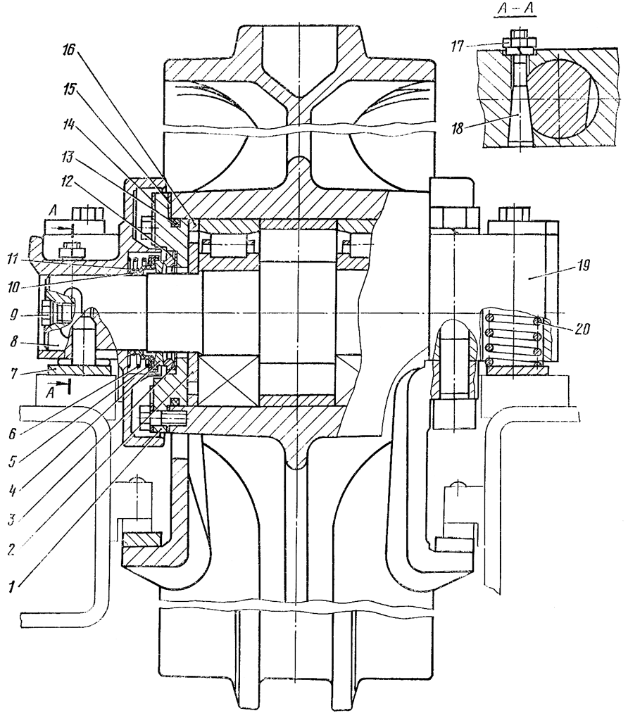Расстопорите болты 1 ( рис. 292 ), стягивающие опоры 3 и упоры 6, и выверните болты из бонок 5. Снимите пружины 6 ( см. рис. 291 ) и обоймы 5. С помощью отвертки снимите пружинное кольцо 11 с манжеты 10. Снимите с оси манжету 10 и кольцо 4 торцового уплотнения. Снимите второе, кольцо 12 торцового уплотнения и прокладку 3.