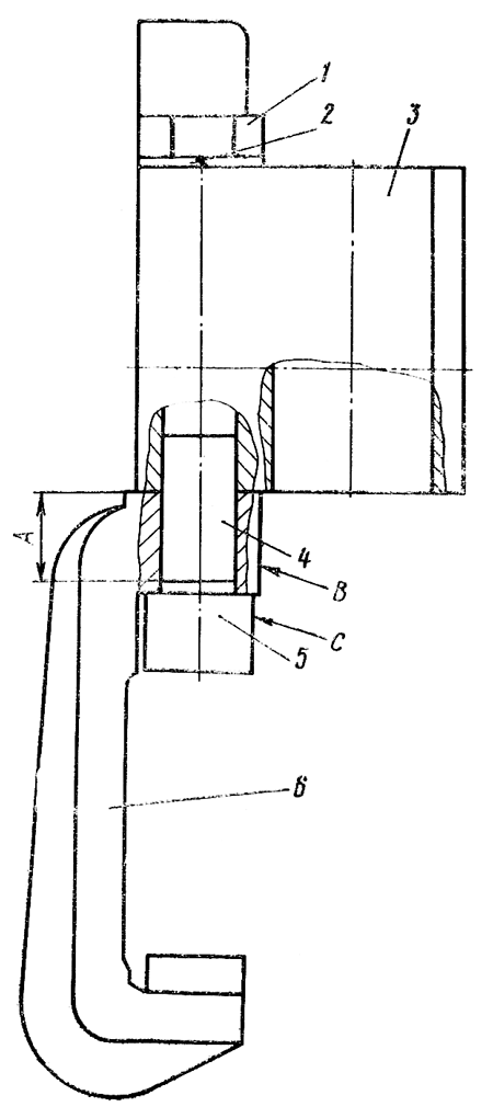Запрессуйте в правую и левую опоры 3 ( см. рис. 292 ) натяжного колеса по Два штифта 4, выдержав размер А = (23±0,9) мм от торца штифта до нижней поверхности опоры. Посадите на штифты упоры 6 и стяните упоры с опорами болтами 1 с бонками 5, подложив под .болты пружинные шайбы. Выступание поверхности С над поверхностью В не допускается. Момент затяжки болтов 350...450 Н-м (35...45 кгс-м). Застопорите болты, отогнув лапки замковых пластин на грани головок болтов.