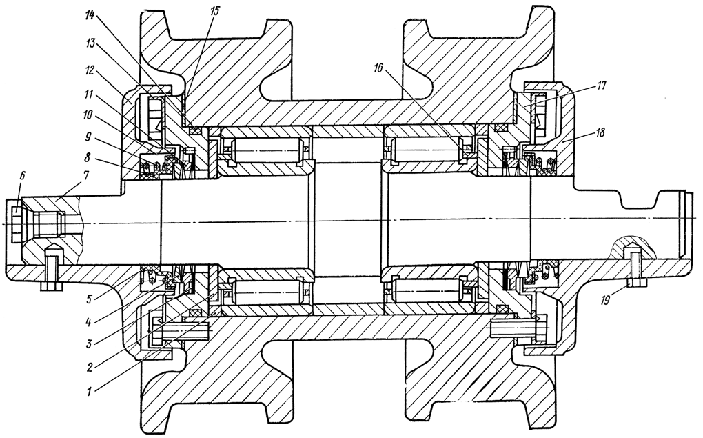 Рис. 283. Ролик опорного катка с наружными кольцами роликоподшипников