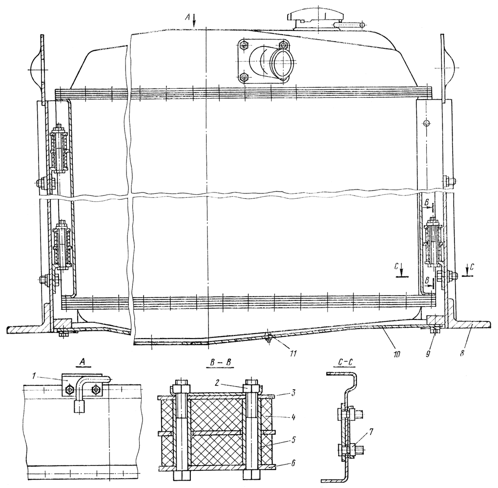 Установите левую и правую боковины 8 радиатора на болты уголков и закрепите каждую четырьмя гайками 7 с двумя стопорными пластинами. Установите опору 10 в сборе с амортизаторами 11 на боковины радиатора и закрепите четырьмя болтами 9 с пружинными шайбами. Установите и закрепите на коллекторе радиатора кронштейн 1 тросика шторки, если он снимался при разборке.