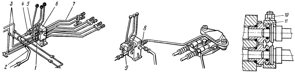 Закрепите на распределителе 5 ( рис. 331 ) шесть рукавов 4: Затяните на штуцере 3 гайку 2 рукава 1. Установите заднюю пластину распределителя. Вставьте в два передних штуцера распределителя б ( см. рис. 324 ) передние трубы 3 и закрепите двумя планками 11 с болтом 10 пружинной шайбой и гайкой 4. Установите переднюю пластину распределителя. Установите крышку люка правого крыла. Наложите на пластины распределителя резиновое уплотнение и установите правую переднюю панель пола и рамку.
