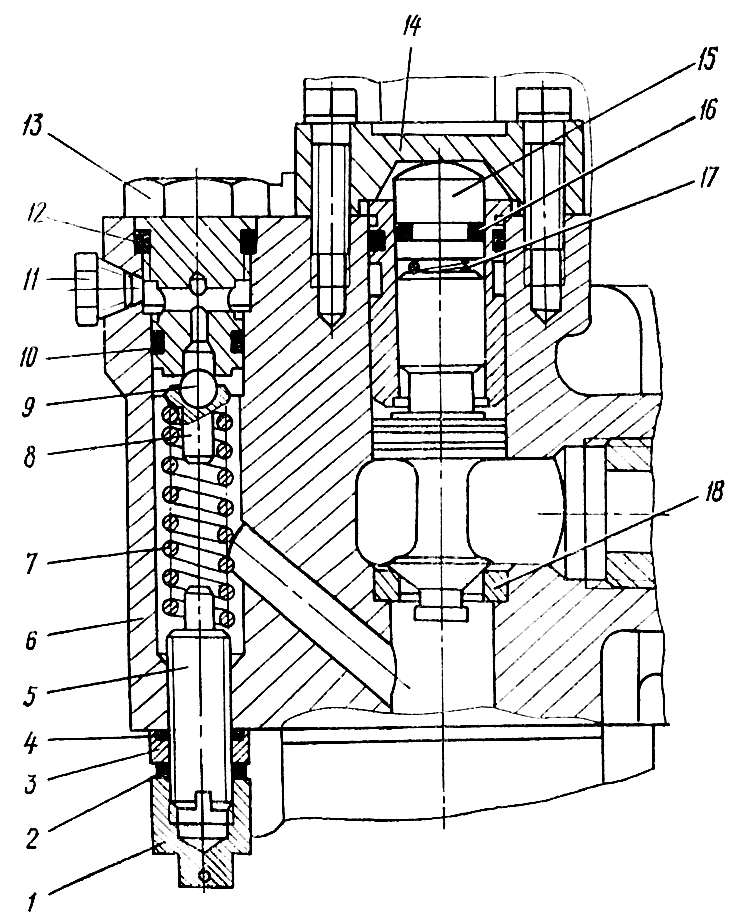 Установите уплотнительное кольцо 4 ( см. рис. 330 ) в выточку гайки 3 и наверните гайку на регулировочный винт 5. Вверните винт в корпус 6 распределителя. Установите пружину 7 в отверстие корпуса распределителя. Обстучите шарик 9 по седлу 13 до появления кольцевого пояска. Установите шарик 9 (Б 9,525—200) в сферическое углубление направляющей 8 и установите направляющую с шариком в отверстие пружины 7. Установите на седло 13 уплотнительные кольца 10 и 12. Заверните седло в резьбовое отверстие корпуса распределителя.