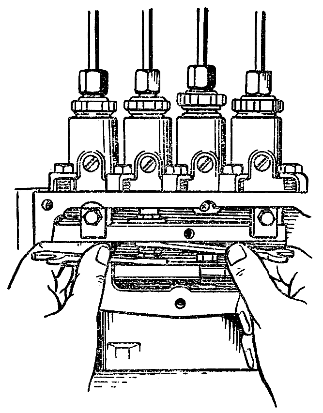 После обкатки проверьте герметичность обратных клапанов секций. Включите стенд и, передвигая взад и вперед тягу рейки, убедитесь в отсутствии пропуска клапанами и вытекания из штуцеров топлива при положении рейки на включенной подаче топлива.