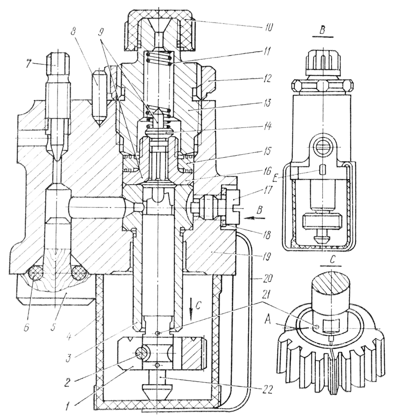 Очистите секцию и промойте снаружи, а затем насухо вытрите. Снимите с секции защитные детали 5, 6 и 10, закрывающие топливные каналы, и колпачок 4 со скобой 20, закрывающий секцию снизу. Выньте из гильзы 3 плунжер 22 с зубчатым сектором. Выверните специальным изогнутым торцовым ключом ПИМ-640.200.01 винт 2 крепления зубчатого сектора 1 на плунжере.