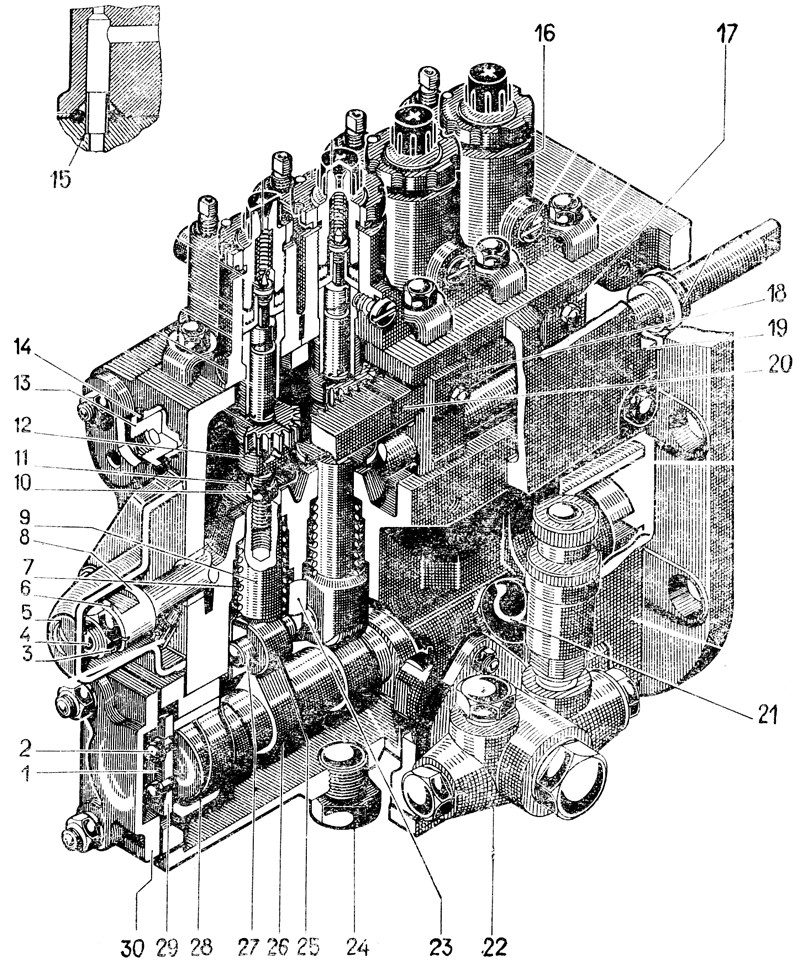 Выньте кулачковый валик 26 вместе с подшипником 28 и прокладкой, поворачивая его так, чтобы затылки кулачков становились против толкателей, утопив их в Гнездах корпуса насоса.