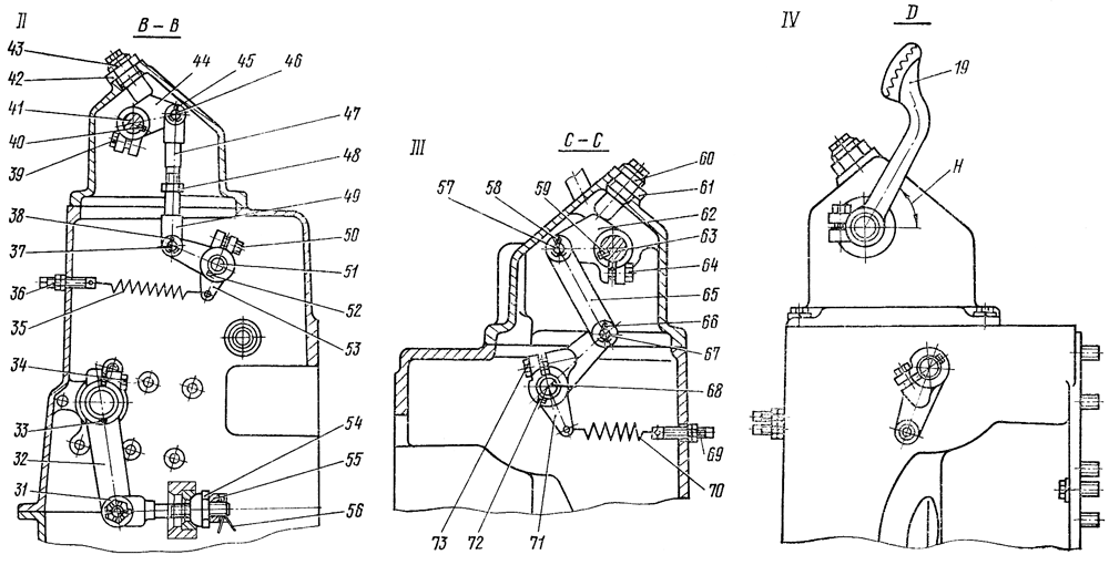 Установите в шпоночный паз оси 63 шпонку, наденьте педаль 19, затяните болт 20. Установите колонку 18 в сборе с тягой, рычагом, педалью на кожух муфты сцепления и заверните четыре болта 17 с пружинными шайбами. Совместите отверстие тяги 65 с отверстием рычага 71, установите палец 67 и зашплинтуйте его. Установите педаль 19 в положение Н так, чтобы угол Н= (60±5)° (положение педали соответствует выключенному горному тормозу), и заверните упор 60 до упора во внутренний рычаг 62. Упор законтрите гайкой 61. Вставьте в отверстие кожуха винт 69 и соедините его с пружиной 70. Проверьте ход педалей. Педали 9 и 19 должны возвращаться в исходное положение после снятия усилия нажатия под действием пружин 70 и 35. Продольный люфт педалей должен быть не менее 1,5 мм.