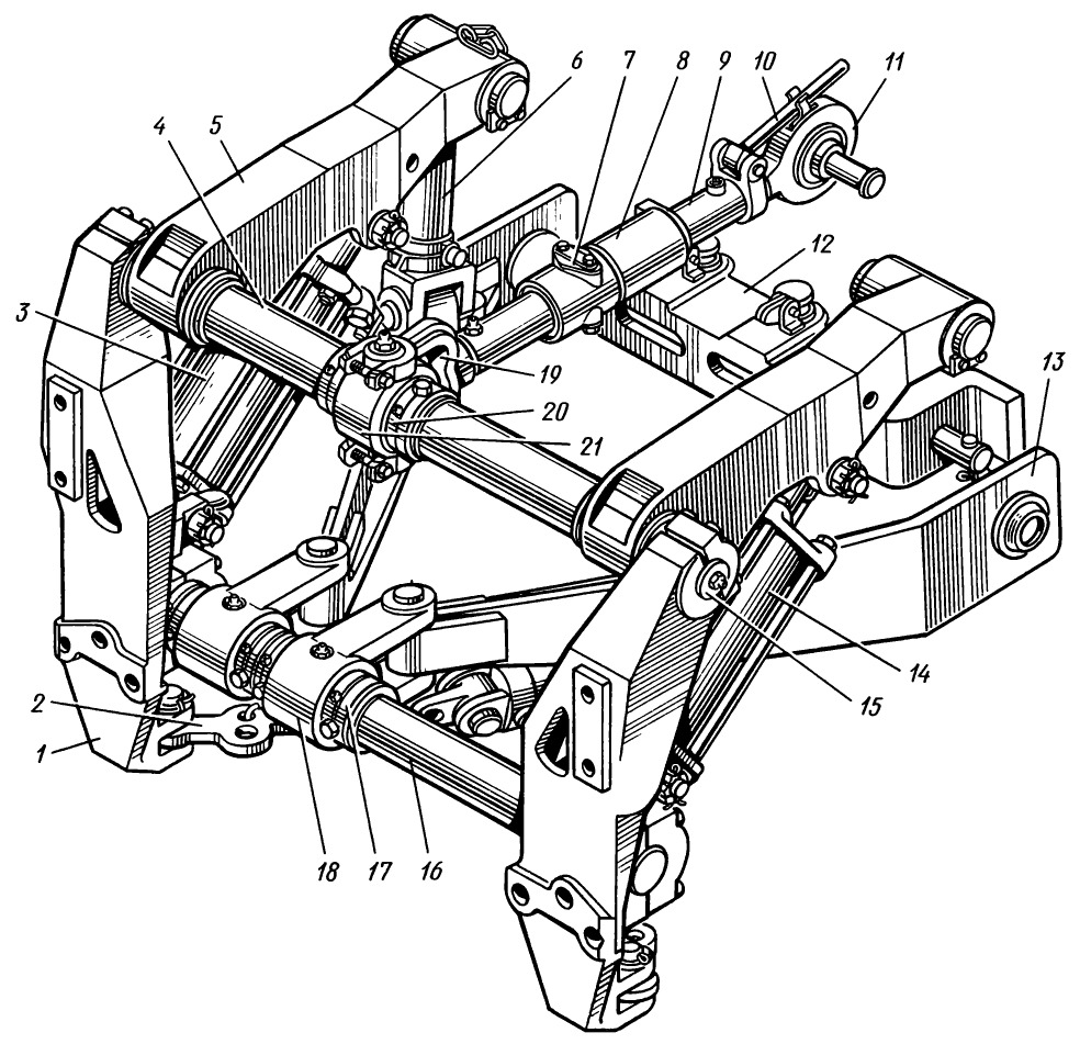 В разрезных цапфах кронштейнов 1 механизма навески вставлены верхняя 15 и нижняя 16 оси. На верхней оси на втулках установлен полый вал 4, на шлицах которого смонтированы два подъемных рычага 5.