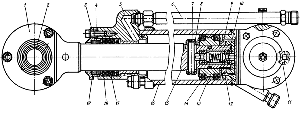 Силовые гидроцилиндры двустороннего действия (рис. 112) шарнирно связаны с нижней осью механизма навески, а их штоки соединены с подъемными рычагами. К гильзе 10 гидроцилиндра приварена нижняя крышка 13, а верхняя 5 присоединена к фланцу гильзы болтами. В отверстие верхней крышки входит шток 9, на котором закреплен поршень 11. Уплотнение штока в крышке и поршня в гильзе осуществляется резиновыми кольцами круглого сечения с защитными шайбами. Чтобы пыль и грязь не проникали в уплотнения штока, в расточку верхней крышки установлен резиновый воротник-чистик 6.