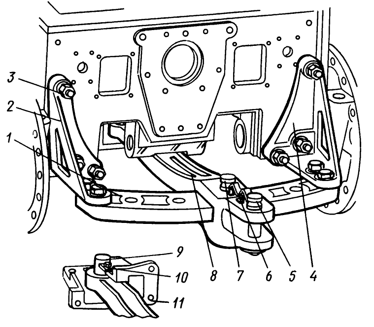 К задней стенке корпуса муфт, поворота крепятся кронштейны 2 и 4, к нижним полкам которых присоединена изогнутая площадка 1 с пятью отверстиями для фиксации прицепной серьги 8. Передний конец прицепной серьги шарнирно закреплен на оси в кронштейне 11, установленном в передней части корпуса муфт поворота. Ось стопорится от проворачивания планкой 10, входящей в прорезь на оси.